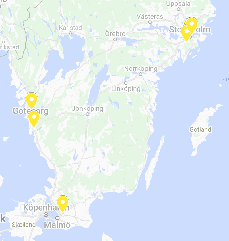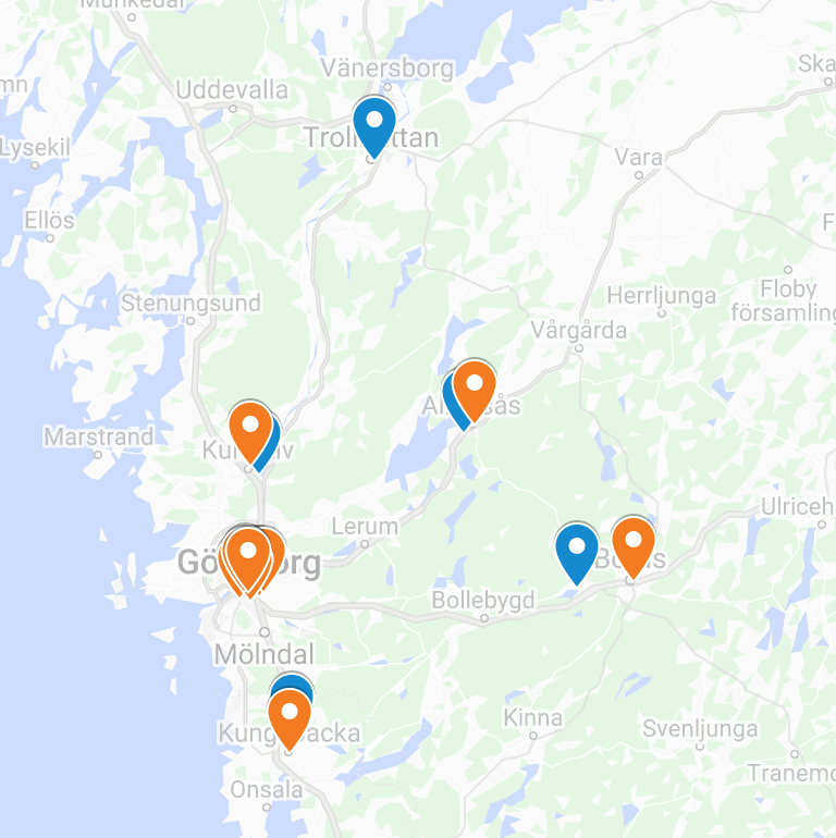Som väntat finns det en stark koncentration av terapeuter kring de platser där Coreutbildningen ges: Stockholm, Göteborg och Lund/Malmö. Så här ser exempelvis utbredningen av ISTDP ut i Göteborgsområdet just nu: